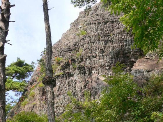 岩倉山遊歩道の途中にあり、岩肌が海からの風に風化・浸食されてお地蔵さまが何体も林立しているような様子から「千体地蔵」と呼ばれています。岩は火山岩の一種である流紋岩で、溶岩が冷えて収縮する際に柱上の割れ目ができ、それが雨風によって削られ、生まれました。